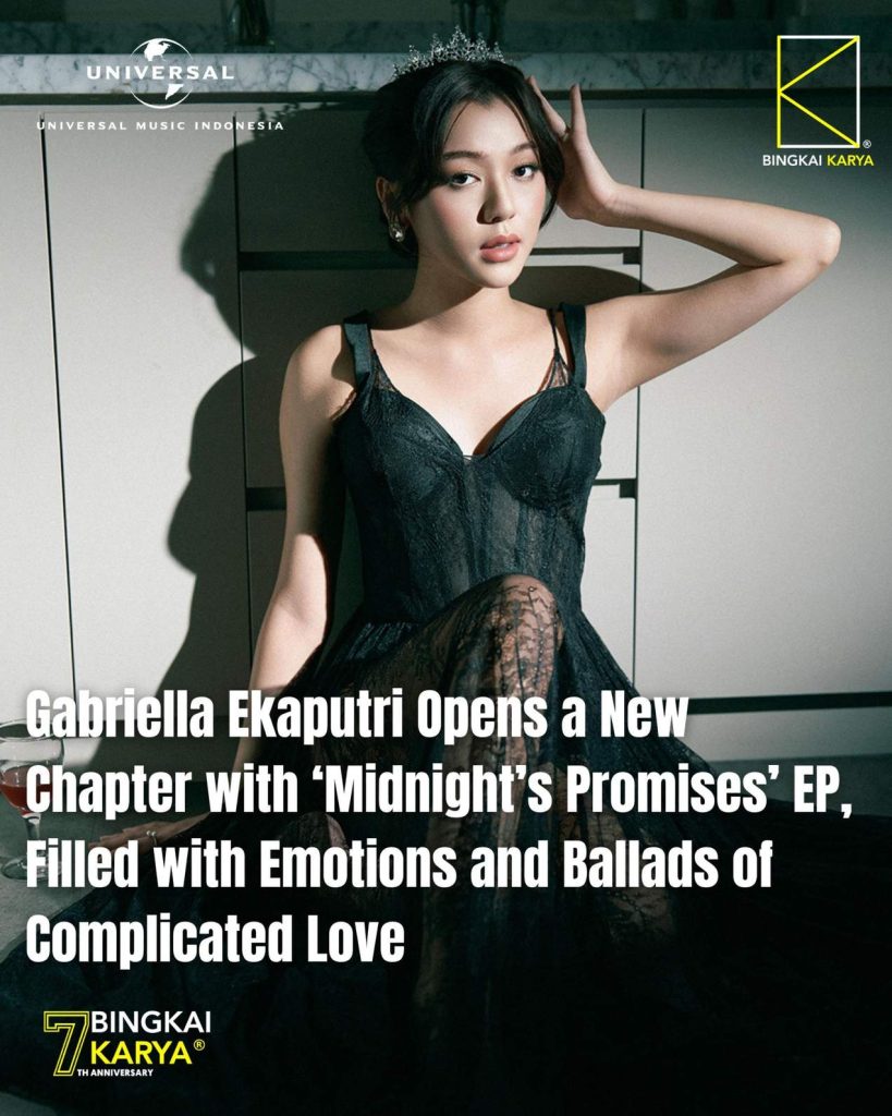 Bingkai Karya – Known as an actress, dancer, singer, and digital personality with millions of followers on social media, Gabriella Ekaputri now takes a bold step forward by releasing her most personal and ambitious work yet, her debut EP ‘Midnight’s Promises’, released under Universal Music Indonesia. More than just a mini album, ‘Midnight’s Promises’ marks Gabriella’s artistic transformation. It is a new chapter that reveals her deepest side while proving she is ready to shine as a world-class solo singer. The EP features four songs that explore themes of emotional wounds, love’s traumas, and broken promises all wrapped in rich, cinematic pop arrangements that are both haunting and heartfelt.